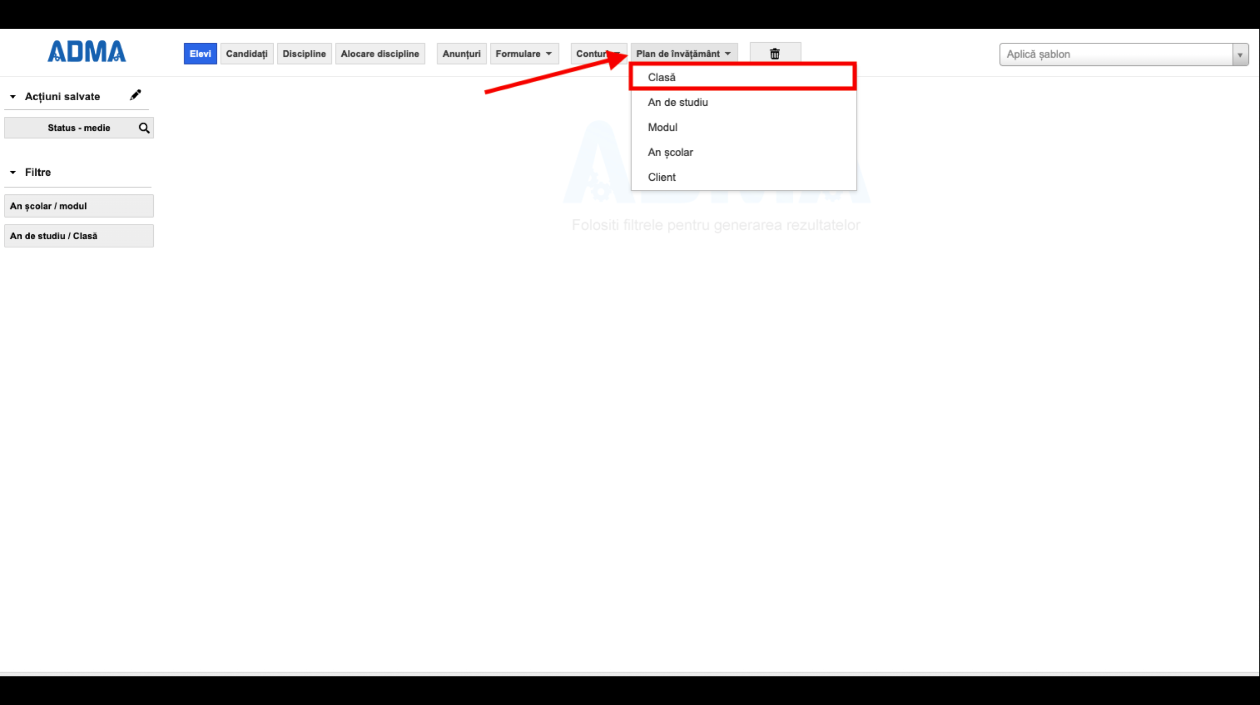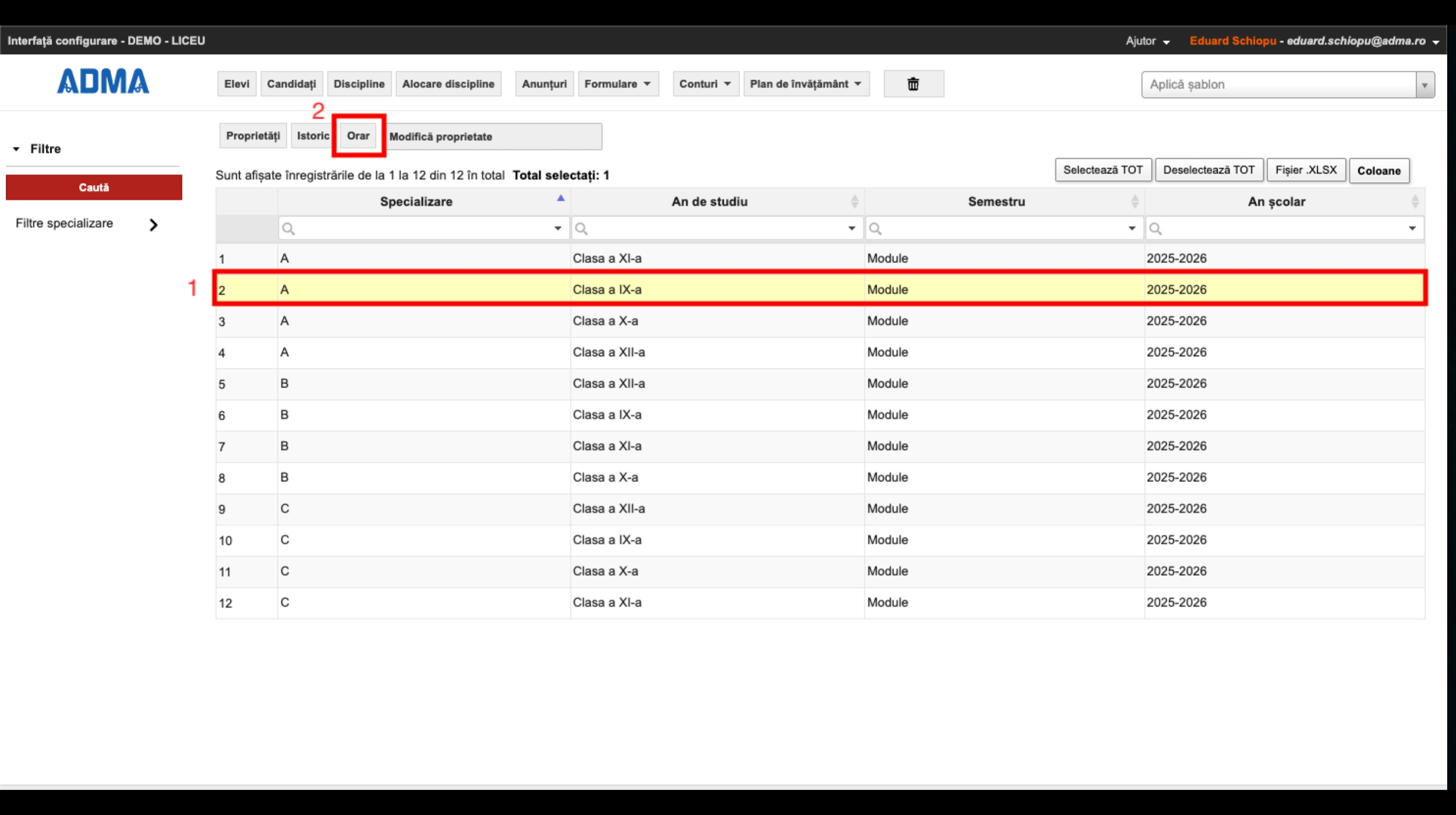 | ✔ GENERARE | 1. Primul pas este sa accesăm Interfața de Secretariat 2. Vom selecta Plan de învățământ > Clasă > butonul roșu Caută. ![]() 3. Vom selecta clasa la care dorim să introducem orarul si vom apăsa pe butonul Orar.(Trebuie sa fim atenți la anul școlar (ultima coloana din tabel) pentru a nu încurca clasele intre mai mulți ani școlari)