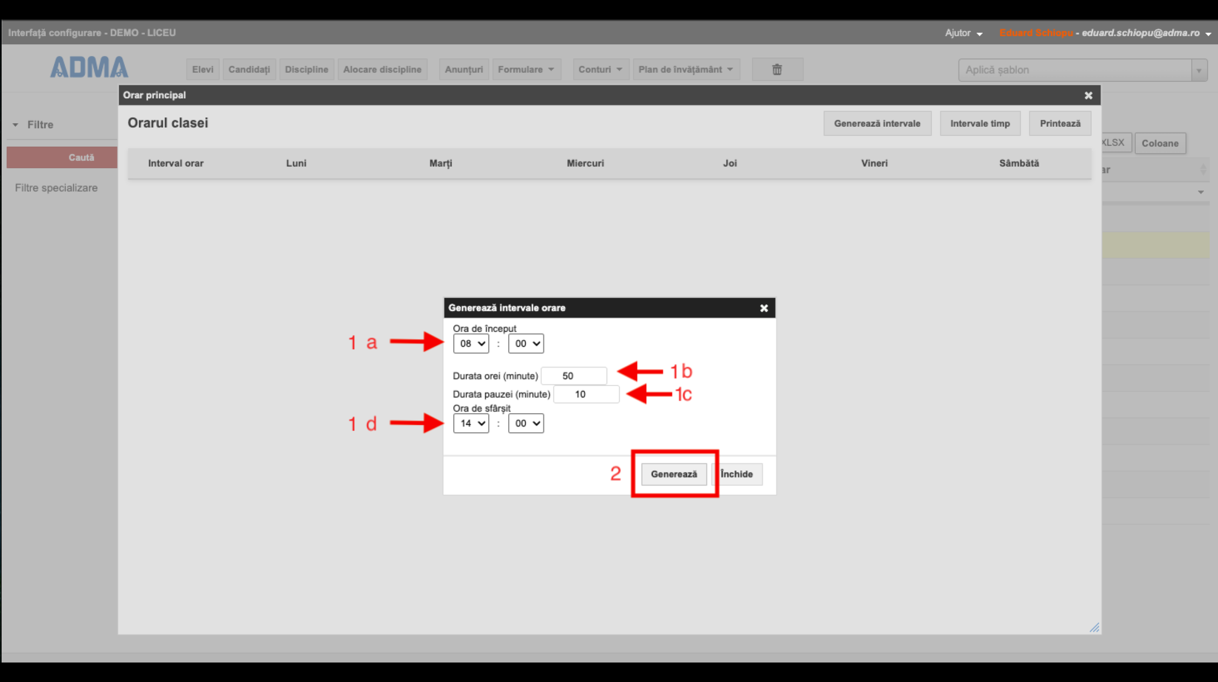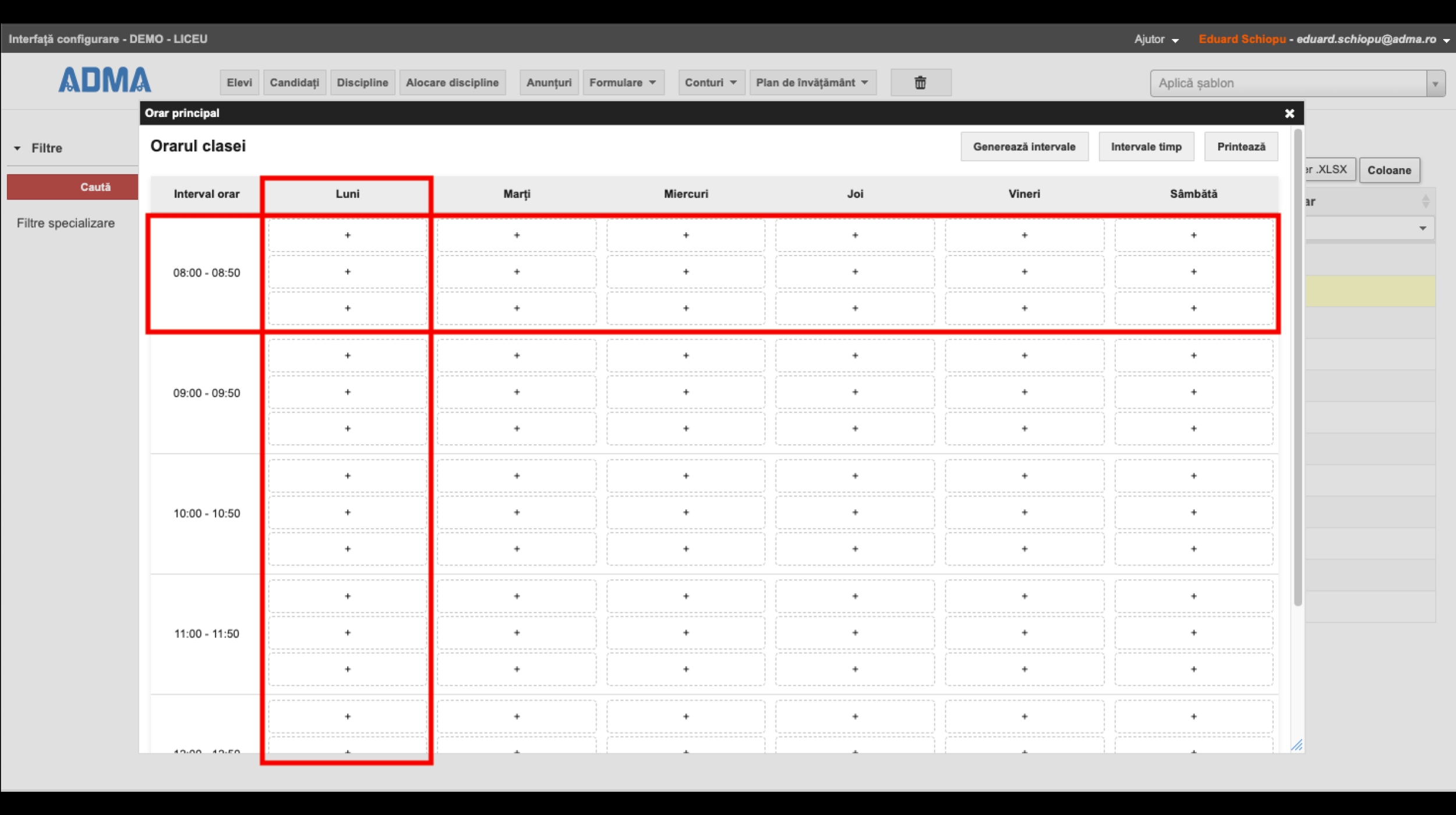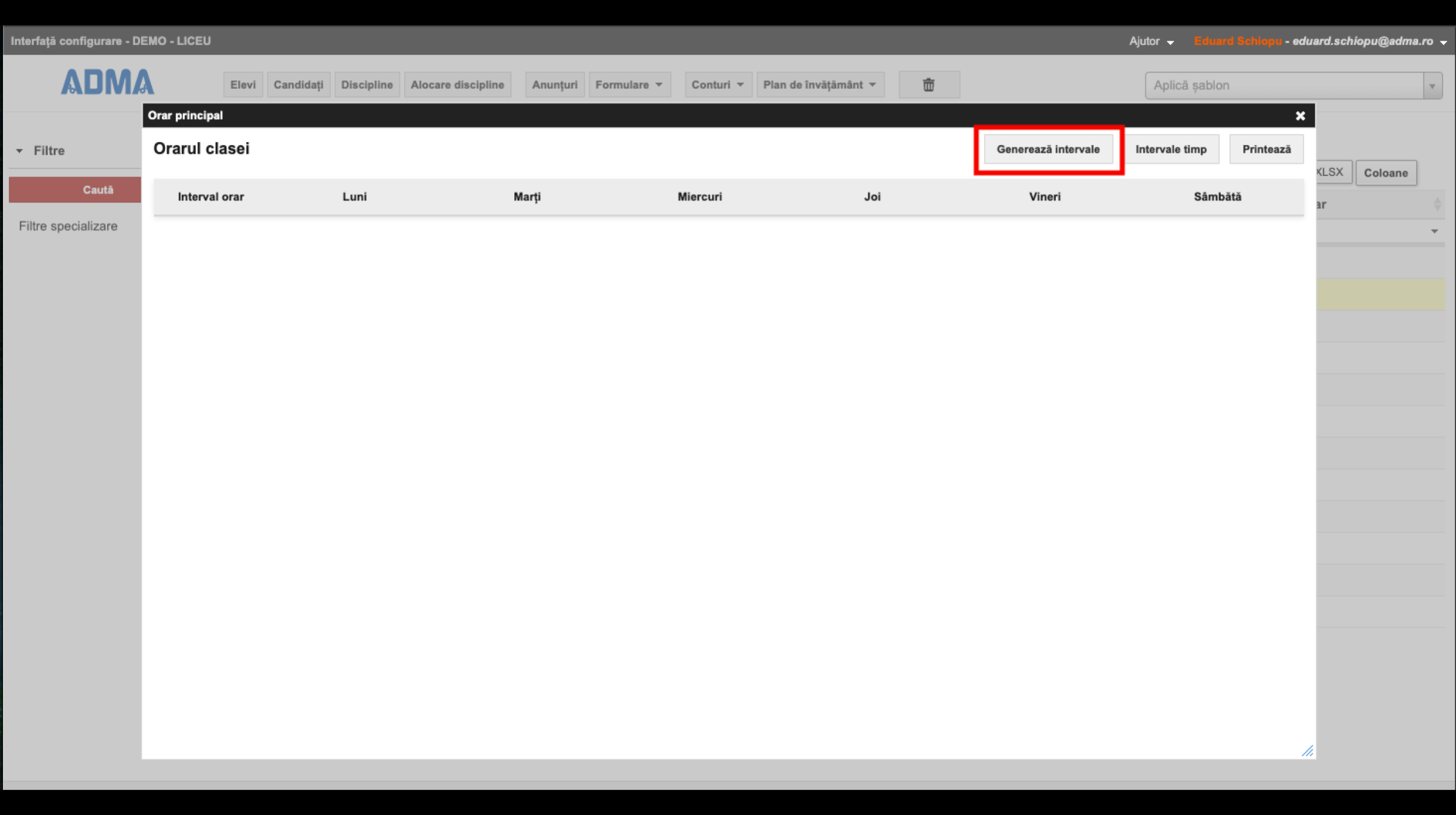 5. Se va afișa o fereastră nouă în care se va deschide un orar gol.Folosim butonul Generează intervale pentru a genera intervalele orare pentru orarul nostru. Acest pas este valabil doar la început când nu aveți intervale create. ![]() 6. Configuram ora de început, durata orei, durata pauzei si ora de sfârșitDaca în orarul dumneavoastră, durata orei este de 50 minute și pauza de 10 minute, ora începe la 8:00 si se termina la 14:00 atunci nu trebuie sa modificați nimic, doar sa apăsați pe butonul Generează și vor fi generate intervalele orare între 08:00 si 14:00, asta înseamnă ca ultima oră va avea interval 13:00 - 13:50. ![]() 7. Completarea disciplinelor Ne vor fi afișate casetele pentru discipline, dăm click pe caseta cu plus si selectăm disciplina pe care dorim sa o adăugam în orar. ![]() * Informații suplimentare